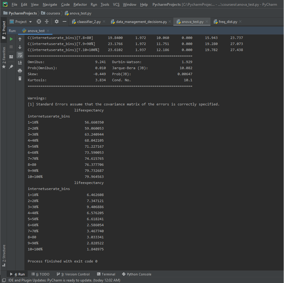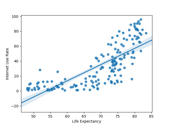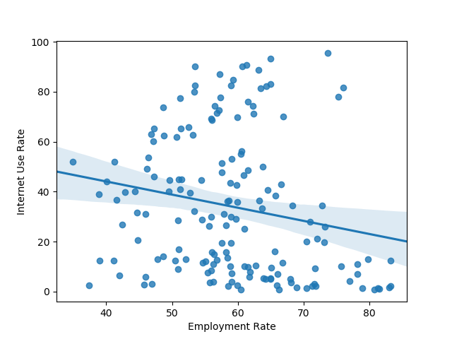 Based on the information above, it looks like life expectancy and internet use rate have a very strong correlation that is highly unlikely to be of chance. Meanwhile, employment rate and internet use see a less robust, though significant correlation. There’s a weak negative correlation for the second two variables.