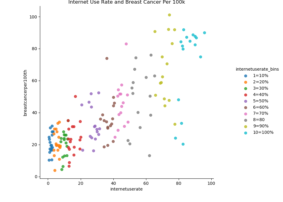 For the Gapminder data I’m investigating whether or not there is a relationship between internet use rate and life expectancy. Because both of the variables are continuous in nature, I start off by binning both the variables. Internet use rate is binned into just two groups: less than 50% of the population with internet access and over 50% internet access. Meanwhile, life expectancy is divided into 10 bins.